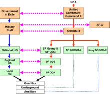 Note that dotted lines run from the underground and auxiliary to Navy and Air special operations units under the UCC Special Operations commander. These indicate that resupply might be brought in by sea or air, and the UW force will use other than the guerrilla force to receive them.[24] Indeed, the guerrillas might make a diversionary attack to draw attention from the logistics or other vulnerable operation.