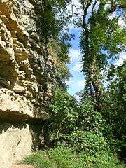 The Undercliff is a landslide complex in Cretaceous soft rocks, a bench of slipped clays and sands above a low sea-cliff, backed by higher (100 metres) Upper Greensand and Chalk cliffs.[2] The largest urban landslide complex in northern Europe, it dates from two main phases of landslides after the last Ice age: 8000–4500 years and 2500–1800 years ago.[3] It is flanked by highly active landslip zones that have seen major slides over the past two centuries: the Blackgang landslip at the west, and the Bonchurch Landslips at the east. The main section is more stable, though there are ongoing concerns over coastal erosion, further slippage and subsidence.[2][4] The main through road, Undercliff Drive, was disrupted by a mud slide near St Lawrence in 2001, requiring 18 months to build a new road section[5] and in 2014 further erosion after heavy rain fell and the road was under repair, leading to more damage, and nine houses being evacuated.[6]