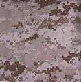 The Marine Corps Combat Utility Uniform or MCCUU is intended for wear in the field or for working parties, but has become the typical working uniform for all deployed and most garrison Marines and Sailors.[3] It is rendered in MARPAT digital camouflage that breaks up the wearer's shape, and also serves to distinguish Marine uniforms from those of other services. Previously, Marines wore the same utility uniforms as the Army. It consists of MARPAT blouse and trousers, green undershirt, and tan (specifically "olive mojave") suede boots. There are two approved varieties of MARPAT, woodland/winter (green/brown/black) and desert/summer (tan/brown/grey). To further distinguish the uniform, upon close examination, the Eagle, Globe, and Anchor can be found within the pattern.
