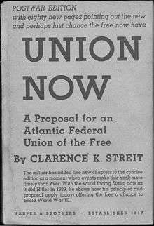 Union Now is a book by journalist Clarence Streit calling for a federal union of fifteen of the world's major democracies. The first edition of the book was published in 1939. The book attracted public attention to world federalist and Atlanticist ideas and helped lay the groundwork for the efforts of Streit's organization Federal Union, Inc. (which later became the Association to Unite the Democracies).[1]