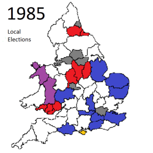 Local elections were held in the United Kingdom in 1985.[1][2][3][4] The projected share of the vote was Labour 39%, Conservative 32%, Liberal-SDP Alliance 26%. Labour had the largest share of the vote in local council elections for the first time since 1981.