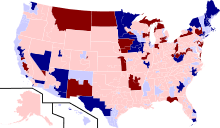 Elections were held for all 435 seats of the House of Representatives, representing the 50 states. Elections were also held for the non-voting delegates from the District of Columbia and four of the five territories. The winners of these elections are serving in the 114th United States Congress, with seats apportioned among the states based on the 2010 United States Census. The Republicans won 16 seats from Democrats, while three Republican-held seats turned Democratic. The Republicans achieved their largest majority in the House since 1928.[2] Combined with the Republican gains made in 2010, the total number of Democratic-held House seats lost under Barack Obama's presidency in midterm elections rose to 77 with these elections. This marked the highest number of House seats lost under a two-term president of the same party since Harry S. Truman.[3] With 36.4% of eligible voters voting, the voter turnout was the lowest since 1942.[4]