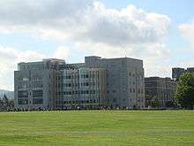 The "Old Cadet Mess Hall" was built on the site of the current Grant Hall in 1852 and served as the dining hall for the Corps of Cadets until it was replaced by Washington Hall and demolished in 1930 to make way for the current Grant Hall.[11] In 1852, Delafield oversaw the construction of the Commandant's headquarter's building and cadet guardhouse on the site of present-day Bradley Barracks. This building helped encircle the cadet "central area", which is similar to the courtyard known in present-day as "Central Area". The Commandant's office was demolished in 1920.[12] The Commandant's offices are on the 4th floor of Washington Hall overlooking the Plain. On the site of present-day Thayer Hall, on the lower rises of the cliffs along the Hudson, the Old Riding Hall was constructed beginning in 1855. The structure was known as the largest equestrian riding hall in the US during its day.[13] This hall stood on the cliff below the Plain until being demolished for a new riding hall in 1908.[14] In 1870, the new academy headquarters building was constructed on the site of present-day Taylor Hall. Meant to house the Superintendent and other academy leadership and staff, this building was too small and inadequate shortly after construction and it was demolished shortly after 1900 to make way for the construction of Taylor Hall.[15] A cadet hospital was constructed in 1884 on the site of present-day Lee Barracks. In 1923, a new wing of the hospital was built, which now houses the Office of Admissions. The main hospital building was demolished in 1960 to make way for Lee Barracks.[16] In the late 1880s Richard Morris Hunt was contracted to design several buildings. The first was a gymnasium, begun in 1891 in an Romanesque Revival design with two large towers flanking a grand arched entrance. The gymnasium was opened in 1893 and used until the early 1920s, when it was demolished to make way for the new mess hall, Washington Hall.[17]
