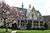 The Superintendent's quarters (1820) and the Commandant's quarters (1821) were constructed on the end of Jefferson Place near the intersection with Washington Road. During the 1800s, Jefferson Road extended further south through what is now North Area and a row of officers' quarters once lined the west side of the road south of the Superintendent's quarters, but those structures were all demolished to make room for the old North Barracks. The next oldest structures on post are the three sets of large duplex officers' quarters just off the northwest edge of the plain. These quarters (c1828), have been expanded over the years and have come to be known as Professor's Row, as they traditionally house the heads of the academic departments. The Dean's quarters were constructed in 1856 between the commandant's quarters and professor's row.[13] A complex of structures known as the "Ordnance Compound" was completed between 1837 and 1840. It consisted of three stone buildings with two towers encircled by a wall. The building that stands in the center of the compound, now the First Class Cadet's social club, was added in 1880.[18] The second academic building was demolished in 1891 and replaced on the same location by what was then known as the West Academic Building. This Richard Morris Hunt designed structure took four years to complete and served as the main academic hall until 1950, when it was converted into a barracks and renamed Pershing Barracks. The large house on the end of Professor's Row, known today as the "Beat Navy House" due to the "Beat Navy Sign" that hangs on its front porch, was built in 1875 and has been used as multiple officer's quarters since its construction.[15] In 1894, McKim, Mead, and White designed and began construction on the new memorial hall, later named Cullum Hall after General George W. Cullum, who started the Cullum Register of Graduates and donated the funds for the structure. Completed in 1898, Cullum Hall broke several architectural traditions. First its classical design and white marble construction clashed with the gray granite Gothic design of the other buildings on the plain. Second, it obstructed the eastern view of the Hudson River.[19] Started in 1900 and completed in 1903, the West Point Officer's Club also was of neo-classical design. However, budget cuts and the high cost of white marble resulted in the selection of an off-color white brick, a design that failed to inspire the imagination of the public at large and the academy leadership. These two structures are the only neo-classical designs left in the cadet area now that the old cadet chapel is moved to the cemetery.[20]