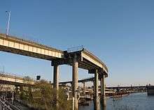 A now unused ramp in Portland, Oregon at the western terminus of I-84 on the east bank of the Willamette River[1] formerly a connection to US99W/Steel Bridge