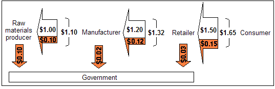 So the consumer has paid 10% ($0.15) extra, compared to the no taxation scheme, and the government has collected this amount in taxation. The retailers have not paid any tax directly (it is the consumer who has paid the tax), but the retailer has to do the paperwork in order to correctly pass on to the government the sales tax it has collected. Suppliers and manufacturers only have the administrative burden of supplying correct certifications, and checking that their customers (retailers) are not consumers.