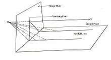 In graphical perspective, a vanishing point is a point in the picture plane that is the intersection of the projections (or drawings) of a set of parallel lines in space on to the picture plane. When the set of parallels is perpendicular to the picture plane, the construction is known as one-point perspective and their vanishing point corresponds to the oculus or eye point from which the image should be viewed for correct perspective geometry.[1] Traditional linear drawings use objects with one to three sets of parallels, defining one to three vanishing points.