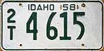 | 1958 | Embossed dark green numbers on white plate with border line; "IDAHO 58" embossed in wide dark green block letters centered at top | "FAMOUS POTATOES" embossed in narrow dark green block letters centered at bottom | A 12345 0/A 12345 |