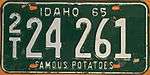 | 1965 | Embossed white numbers on dark green plate with border line; "IDAHO 65" embossed in wide white block letters centered at top | "FAMOUS POTATOES" embossed in narrow white block letters centered at bottom | A 12345 0/A 12345 |