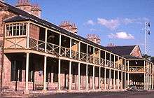 The Regency style Main Barracks building was constructed of Hawkesbury sandstone by convicts between 1841 and 1846. The first building completed was the Officers' Quarters which was completed in 1842.