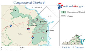 Encompassing much of Northern Virginia's suburbs of Washington, D.C., Virginia's 8th District includes Arlington County, parts of Fairfax County, and the independent cities of Alexandria and Falls Church.