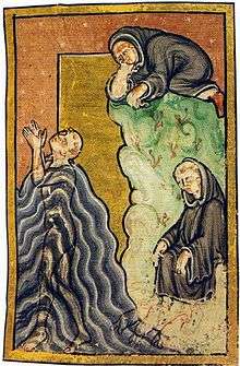 It was commissioned by Bishop Eadfrith (died 721), the bishop famous for the Lindisfarne Gospels who also commissioned Bede's Prose Life of the saint.[6] The Anonymous Life was organised into four books; though this was not common in the literature of the day, it followed the organization of the metrical Vita Sancti Martini of Venantius Fortunatus, Gregory of Tours' De Virtutibus Sancti Martini and the Dialogi of Gregory the Great (containing an account of the life of Benedict of Nursia).[7] This may be an indication that the author regarded Cuthbert as a saint of stature comparable with Benedict and Martin.[8]