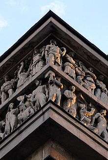 The second half of the 1920s was marked by high-profile architectural contests dominated by modernist architects. Shchuko and Gelfreikh lost the Kiev Passenger Railway Station contest to Pavel Alyoshin and Andrey Verbitsky,[20] but in 1928 secured a winning bid on the contest to design the Lenin Library in Moscow. The initial draft[21] comprised a complex network of low-rise buildings facing Mokhovaya Street and a π-shaped high-rise tower of the main depository at the back of the block. Construction commenced in 1930[22] and was substantially complete in 1941; expansions continued into the 1970s. The built structure disposed with the complexity of the original proposal; the depository, completed in 1941, is a plain 19-floor elongated slab.[23] Among many artists involved in decorating the Library, Shchuko is personally credited for the design of the sculptural frieze facing Mokhovaya and Vozdvizhenka streets. Modern authors consider the Library, along with the Mayakovskaya station, to be Moscow's nearest approximations of Art Deco style and compare it to the 1937 Palais de Chaillot in Paris.[24]