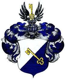 A golden key on a blue background with the top facing downwards; on the helmet a key is depicted between two and six black cock feathers. Several variations of the colours of the key and the shield are available in different sources.