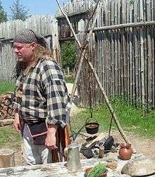 There were three major influences that molded the lives of voyageurs. Firstly, their background of French-Canadian heritage as farmers featured prominently in their jobs as voyageurs. The latter was seen as a temporary means of earning additional income to support their families and expand their farms.[18] Most voyageurs were born in New France. However, fur trading was not an everyday experience for most of the colonial population. Roughly two thirds of the population did not have any involvement in the fur trade.[19] The second influence came from the Native communities. By experiencing the same conditions as the Natives and interacting with them, the voyageurs learned that using the same clothing and tools as them, they could make the most of their environment. Although this influence worked both ways; the Natives coveted certain objects which they received in trade with the voyageurs.[20] The final influence was the social structure of the voyageurs life. Since this group included only men, it embodied masculinity itself. These men engaged in activities such as gambling, drinking, fighting; interests which were reserved for men of this trade.[20]
