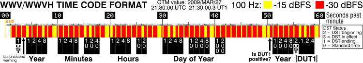 - The audio tones sent during the first 45 seconds of most minutes are swapped: 600 Hz is played during even minutes, and 500 Hz is played during odd minutes. (Receiving both simultaneously gives the listener a sound similar to a continuously-ringing chime.)