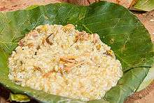 Wachipa is a typical Kirat dish made with rice, minced chicken, and powder made out of burnt feathers of a chicken. The powder gives a unique bitter taste. Vegetarian wachipa is made by replacing meat with leaves or flowers of a plant called Damlapa, which is also bitter. It is eaten on special occasions. It is believed that consumption of wachipa cures body aches.[1] It is called Wamik in Lohorung.