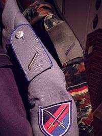 In the German military, Waffenfarbe (German: "corps colour") is a means the armed forces use to distinguish between different corps or troop functions in its armed services. The Waffenfarbe might be the colour of the collar patch, of the piping (coloured edging) around the shoulder boards or shoulder marks and — for enlisted ranks — of the piping around the collar and the garrison cap (Schiffchen). (In the latter places, NCO's wear cords of dark gold, officers silver, and generals gold.)[1]