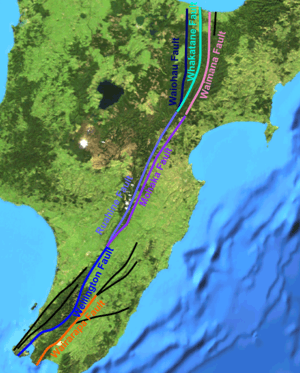 The Wairarapa Fault is an active seismic fault in the southern part of the North Island of New Zealand. It is a dextral (right lateral) strike-slip fault with a component of uplift to the northwest as expressed by the Rimutaka Range. It forms part of the North Island Fault System, which accommodates the transfer of displacement along the oblique convergent boundary between the Indo-Australian Plate and Pacific Plate.[1]