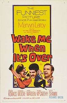 Wake Me When It's Over is a 1960 DeLuxe Color comedy film starring Ernie Kovacs and Dick Shawn in CinemaScope. A World War II veteran gets called back into service by mistake and sent to a dreary Pacific island. It is based on the novel of the same name by Howard Singer.