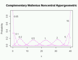 Probabilities in the complementary distribution are calculated from Wallenius' distribution by replacing n with N-n, xi with mi - xi, and ωi with 1/ωi.