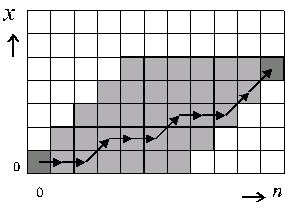 The most reliable calculation method is recursive calculation of f(x,n) from f(x,n-1) and f(x-1,n-1) using the recursion formula given below under properties. The probabilities of all (x,n) combinations on all possible trajectories leading to the desired point are calculated, starting with f(0,0) = 1 as shown on the figure to the right. The total number of probabilities to calculate is n(x+1)-x2. Other calculation methods must be used when n and x are so big that this method is too inefficient.