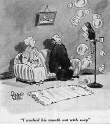 In 1953, Wisconsin judge Harvey L. Neelan fined a Miss Mertz $25 for her drunken obscenities and noted that she should be required to wash her mouth with soap.[15] In 1963, Michigan judge Francis Castellucci ordered Louis Winiarski, who had been found using obscene language around women and children, to wash his mouth with soap before leaving the courtroom.[16] A similar case in October 1979 saw a New York resident choose to wash his mouth out with soap, rather than serve ten days in prison for his disorderly conduct and obscenities.[17]