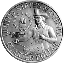 In January 1973, Representative Richard C. White introduced legislation for commemorative dollars and half dollars for the 1976 United States Bicentennial.[37] On June 6, Mint Director Mary Brooks testified before a congressional committee, and responding to concerns that only the two least-popular denominations would be changed, agreed to support the temporary redesign of the quarter as well.[38] On October 18, 1973, President Richard Nixon signed legislation mandating a temporary redesign of the three denominations for all coins issued after July 4, 1975 and struck before January 1, 1977. These pieces would bear the double date 1776–1976. In addition to circulation pieces, Congress mandated that 45 million Bicentennial coins be struck in 40% silver.[39] Fearful of creating low-mintage pieces which might be hoarded as the cent recently had been, thus creating a shortage of quarters, in December 1974 the Mint obtained congressional approval to continue striking 1974-dated quarters, half dollars and dollars until Bicentennial coinage began. Accordingly, there are no 1975-dated quarters.[40][41][42] Almost two billion Bicentennial quarters were struck,[43] as the Mint sought to assure that there would be plenty of souvenirs of the anniversary.[44] The Mint sold the silver sets, in both uncirculated and proof, for more than a decade before ending sales at the end of 1986.[45] Jack L. Ahr's colonial drummer, which had appeared on the Bicentennial quarter, was replaced after 1976 by Flanagan's original reverse.[34]