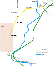 State Route 823 begins at Exit 30 from I-82 a short distance southeast of Selah, one mile (1.6 km) north of the junction of U.S. Route 12 and I-82. Exit 30 is the Rest Haven Road/South Selah exit. SR 823 then crosses the Yakima River and follows Rest Haven Road NNW about 0.9-mile (1.4 km), where its name changes to South Selah Road as it enters the town of Selah. At the southern edge of Selah, the road turns due north and becomes South First Street, the main street of Selah. First Street continues north until the intersection with Naches Avenue at the center of downtown Selah. SR 823 turns right (east) onto East Naches Avenue, continues one-tenth of a mile to the intersection with North Wenas Road, then turns NNE onto North Wenas Road. SR 823 continues 1.2 miles (1.9 km) on North Wenas Road to the junction with Harrison Road, where the highway then turns northeast. SR 823 follows Harrison Road as it runs northeast and then east, re-crosses the Yakima River, and continues to its terminus at State Route 821, known locally as Firing Center Road to the east and Canyon Road to the north. Firing Center Road is so named because it is the entrance to the Yakima Training Center, a large U.S. Army center for weapons training in the hills east of Yakima.