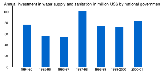 | Annual investment in water supply and sanitation | US$0.55/capita (Average 1994/95-2000/01)[8][9] | |