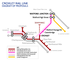 Another proposal to bring London Underground service to Watford Junction is the Croxley Rail Link,[4] which envisages diverting the Watford branch of the Metropolitan line along a re-opened stretch of track to the west of Watford, effectively reinstating the former Croxley Green to Watford Junction service. Underground trains would then join the DC line at Watford High Street, potentially forming an interchange either with London Overground or the Bakerloo line, depending on the outcome of other projects. Funding for this project has now been agreed as of 23 November 2015 and the Metropolitan line will gain an interchange with Overground services.[5]