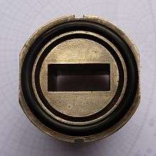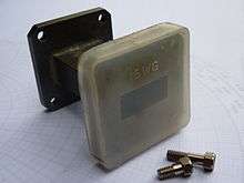 A waveguide flange is a connector for joining sections of waveguide, and is essentially the same as a pipe flange—a waveguide, in the context of this article, being a hollow metal conduit for microwave energy. The connecting face of the flange is either square, circular or (particularly for large[1] or reduced-height rectangular waveguides), rectangular. The connection between a pair of flanges is usually made with four or more bolts, though alternative mechanisms, such as a threaded collar, may be used where there is a need for rapid assembly and disassembly.[1] Dowel pins are sometimes used in addition to bolts, to ensure accurate alignment, particularly for very small waveguides.