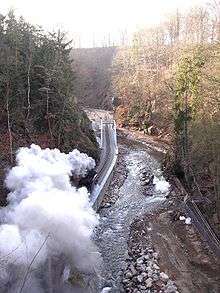 The Weißeritz Valley Railway (German: Weißeritztalbahn) is a steam operated narrow gauge railway in Saxony, Germany. The line connects Freital, near Dresden, with Kurort Kipsdorf, in the Erzgebirge mountains, and follows the valley of the Red Weißeritz. It was badly damaged by major flooding in 2002 and is only partially operational, with fully restoration expected in 2016.[3]