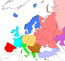 Regions of Europe based on CIA world factbook. Western Europe in light blue; Southwestern Europe in red