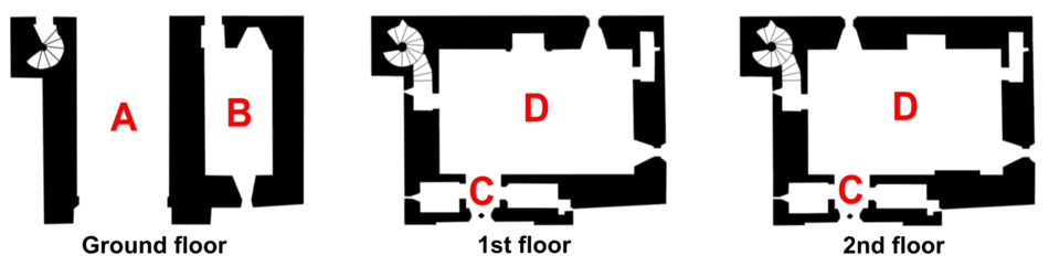 The ground floor includes a barrel vaulted entrance passageway and a porters' lodge, the latter 5.3 by 3 metres (17.4 by 9.8 ft) in size.[1] The first and second floors both formed single rooms, approximately 7.6 by 5.2 metres (25 by 17 ft) across internally, and would have been used as domestic chambers for the officials of the priory.[10] They had fireplaces, garderobes and small bed chambers in the walls.[10] The roof is predominantly built of timbers dating from between 1512 to 1536; the current structure was probably built around 1540, possibly when the building was converted for use as a vicarage.[11]