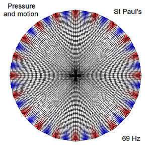 Rayleigh developed wave theories for St Paul’s in 1910[5] and 1914.[6] Fitting sound waves inside a cavity involves the physics of resonance based on wave interference; the sound can exist only at certain pitches as in the case of organ pipes. The sound forms patterns called modes, as shown in the diagram.[1]