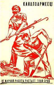 Agitprop propaganda poster used to motivate convict laborers during the construction. The writing says: 'Canal Army soldier! The heat of your work will melt your prison term!'