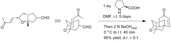 The Wieland–Miescher ketone is the Robinson annulation product of 2-methyl-1,3-cyclohexanedione and methyl vinyl ketone. This compound is used in the syntheses of many steroids possessing important biological properties and can be made enantiopure using proline catalysis.[14]