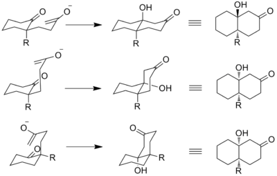 Studies have been completed on the formation of the hydroxy ketones in the Robinson annulation reaction scheme. The trans compound is favored due to antiperiplanar effects of the final aldol condensation in kinetically controlled reactions. It has also been found though that the cyclization can proceed in synclinal orientation. The figure below shows the three possible stereochemical pathways, assuming a chair transition state.[7]