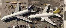 The widebody age began in 1970 with the entry into service of the first widebody airliner, the four-engined, partial double-deck Boeing 747.[16] New trijet widebody aircraft soon followed, including the McDonnell Douglas DC-10 and the Lockheed L-1011 TriStar. The first widebody twinjet, the Airbus A300, entered service in 1974. This period came to be known as the "widebody wars".[17]