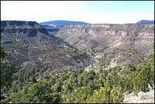 The recreation area is located in the high plains 20 miles (32 km) from Questa. It is accessed via NM 378 off of NM 522.[1] It is located west of the Sangre de Cristo Mountains, east of the Tusas Mounatians on the Taos Plateau volcanic field.[2] The Rio Grande and Red River, both designated National Wild and Scenic Rivers System, intersect in the park at a 800-foot (240 m) deep canyon. It has ancient forests of juniper and piñon trees.[1] Geographic features include volcanic cones, black rock canyons, and cliffs.[3]