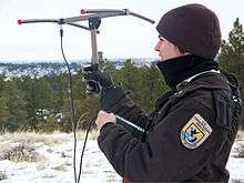 The operator uses an antenna that is attached to a receiver, which is programmed to the transmitter's frequency, to pick up the electromagnetic signals given off by the transmitter affixed to the target animal.[1] Receiver antennas may be hand-held or mounted on an object, and they are available in a variety of forms and functions. These antennas are also tuned to the proper frequency for the transmitter. The receiver produces a tone that increases in loudness or has a visual signal strength indicator that pulses as the operator approaches the transmitter.[3] Omnidirectional antennas have no additional elements and are used to determine the presence or absence of a signal, not its exact location. Elements are added segments of an antenna to increase the range of detectability of the receiver. Adcock antennas consist of two elements and are used to locate the direction of the signal. Loop antennas are small and useful for locating low frequency transmitters. The Yagi antenna contains 3 or 4 elements and is a strong, directional antenna commonly used to determine the location of a transmitter. Antennas can also be affixed to towers. This allows the antenna to be positioned higher, avoiding interference from buildings and trees. Boat, aircraft, and vehicle-mounted antennas allow the operator to exploit a larger area while tracking.[3]