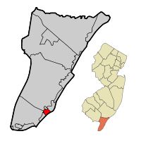 ![]() Map of Wildwood in Cape May County. Inset: Location of Cape May County highlighted in the State of New Jersey. | |