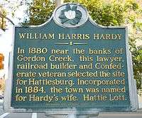 William H. Hardy (1837−1917) founded the cities of Hattiesburg, Mississippi, Laurel, Mississippi, and the city of Gulfport, Mississippi.