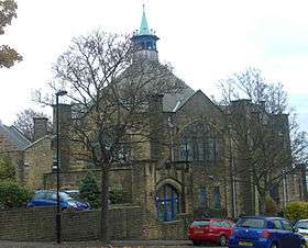 In 1907 Hale completed another commission for the Sheffield Education Committee. Lydgate Lane Council School at Crosspool was a continuation of the Arts and Crafts style used so successfully at Hammerton Street, but the school was no duplicate and has a distinctive design built in gritstone from the Bole Hill or Bell Hagg quarries.[7] In 1908 Hale became involved in the design of Victoria Hall in central Sheffield. He had finished second in a competition to design the building to the firm of Waddington, Son and Dunkerley, but after the death of the original architect, William Angelo Waddington, in January 1907, Hale took over. The extent of Hale's alterations to the original plans is unclear,but the tower and its uppermost elevations were considerably changed.[8]