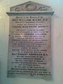 William Milne (April 1785 – 2 June 1822) was the second Protestant missionary sent by the London Missionary Society to China, after his colleague, Robert Morrison.[1] Milne served as pastor of Christ Church, Malacca, a member of Ultra-Ganges Mission, the first Principal of Anglo-Chinese College, and chief editor of two missionary magazines: Indo-Chinese Gleaner (English), and Chinese Monthly Magazine (察世俗每月統記傳). Due to Milne's distinguished role in his missionary field, the University of Glasgow granted him a Doctor of Divinity (D.D.) in 1820.