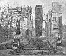 During the 1840s, he had the Leviathan of Parsonstown built, a 72-inch (6 feet/1.83 m) telescope at Birr Castle, Parsonstown, County Offaly. The 72-inch (1.8 m) telescope replaced a 36-inch (910 mm) telescope that he had built previously. He had to invent many of the techniques he used for constructing the Leviathan, both because its size was without precedent and because earlier telescope builders had guarded their secrets or had simply failed to publish their methods. Details of the metal, casting, grinding and polishing of the 3-ton 'speculum' were presented in 1844 at the Belfast Natural History Society.[6] Rosse's telescope was considered a marvellous technical and architectural achievement, and images of it were circulated widely within the British commonwealth. Building of the Leviathan began in 1842 and it was first used in 1845; regular use waited another two years, due to the Great Irish Famine. It was the world's largest telescope, in terms of aperture size, until the early 20th century. Using this telescope Rosse saw and catalogued a large number of nebulae (including a number that would later be recognised as galaxies).