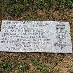 A plaque was placed in his honor at Berkeley Plantation in Virginia in June, 2012 by the Vermont Civil War Hemlocks. The plaque states: "At Harrison's Landing on July 4, 1862, Willie Johnston—age 11, 3rd Vermont Drummer Boy played for Div. review. For keeping his drum during the arduous 7 days battles, he was awarded the Medal of Honor by Sec. of War Stanton. He remains the youngest recipient of the Medal of Honor. His gravesite is unknown. Dedicated June 2012 The Vermont Civil War Hemlocks. (Harrison's Landing is located at Berkeley Plantation in Virginia.)