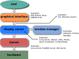 On systems using the X window system, there is a clear distinction between the window manager and the windowing system. Strictly speaking, an X window manager does not directly interact with video hardware, mice, or keyboards – that is the responsibility of the display server.