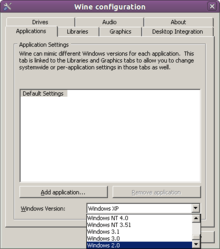 Wine ensures good backward compatibility with legacy Windows applications, including those written for Windows 3.1.[35] Wine can mimic different Windows versions required for some programs, going as far back as Windows version 2.0.[36] However, Windows 1.x and Windows 2.x support was removed from Wine development version 1.3.12. If DOSBox is installed on the system (see below on MS-DOS), Wine development version 1.3.12 and later nevertheless show the "Windows 2.0" option for the Windows version to mimic, but Wine still won't run most Windows 2.0 programs because MS-DOS and Windows functions are not currently integrated.